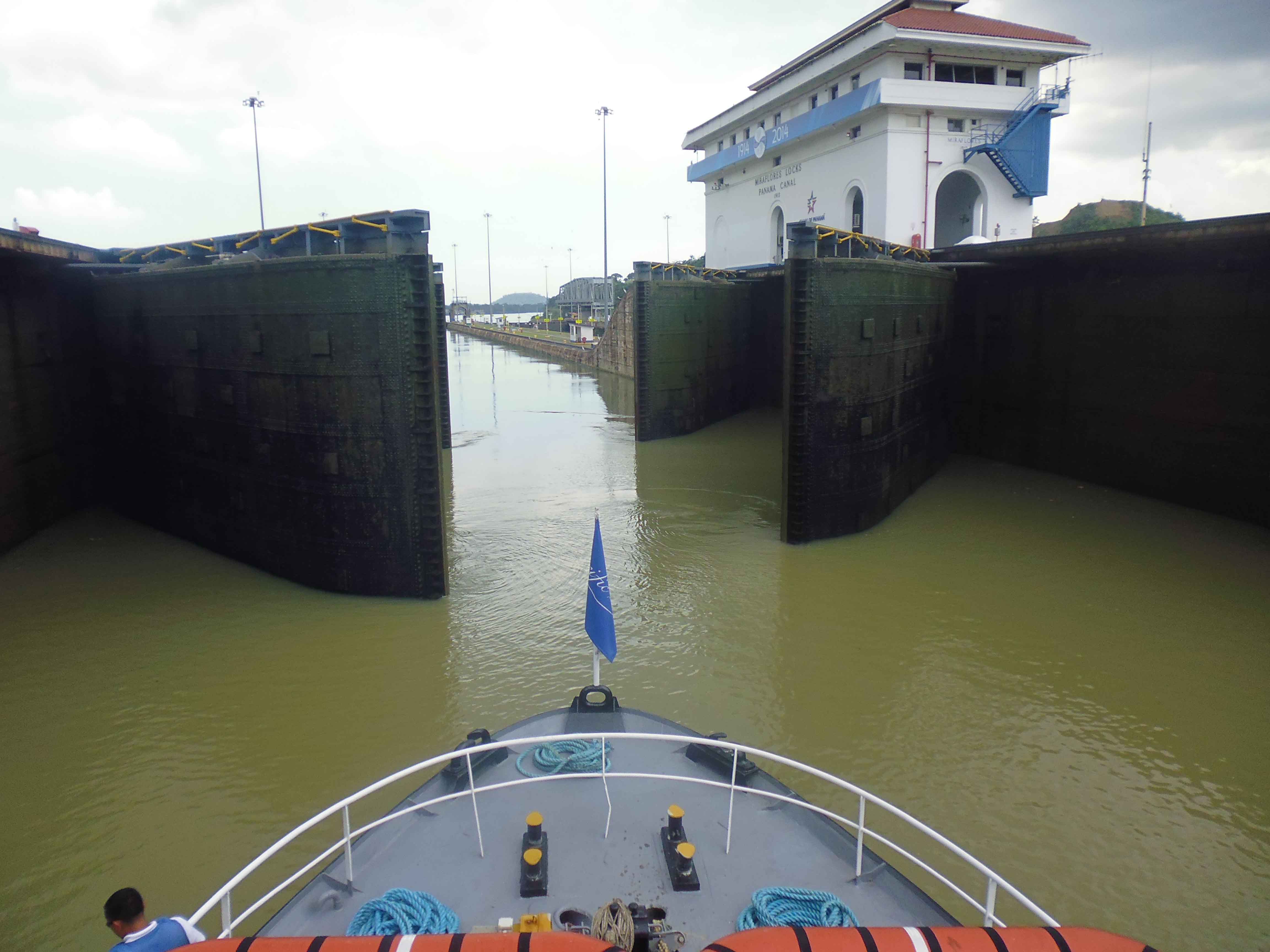 My view from a boat passing through the Miraflores Locks in the Panama Canal.