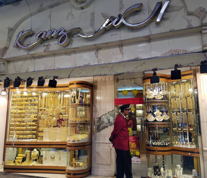 A store in the Gold Souk, a specialized marketplace consisting of stores that sell gold jewelry — and, in some cases, buy or sell old gold.