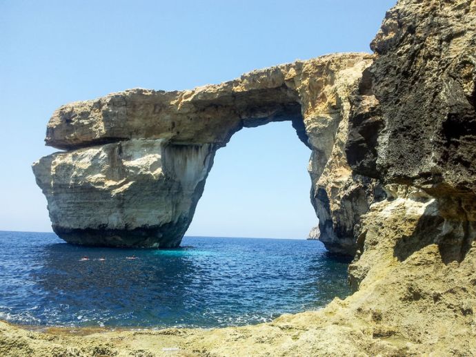 Until March 8, 2017, one of the principal attractions on the island of Gozo was the Azure Window, a natural limestone formation in the shape of an arch. But on that date – less than 4 months prior to my visit to Malta – the Azure Window collapsed. The arch had weakened in preceding years, and it finally fell apart in bad weather last year. Here’s a stock photo of how the Azure Window appeared when it was still intact:
