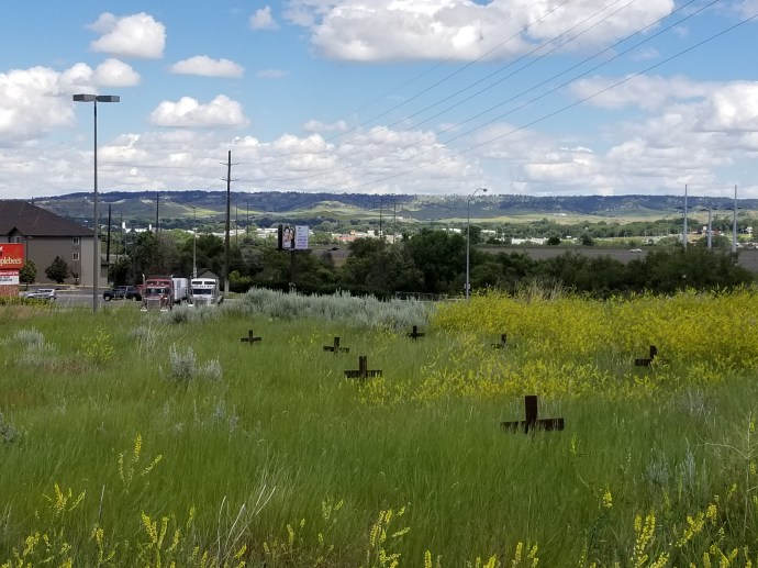 Crosses identifying unmarked graves poke up through the overgrown grass and weeds in Billings’s Boot Hill Cemetery.