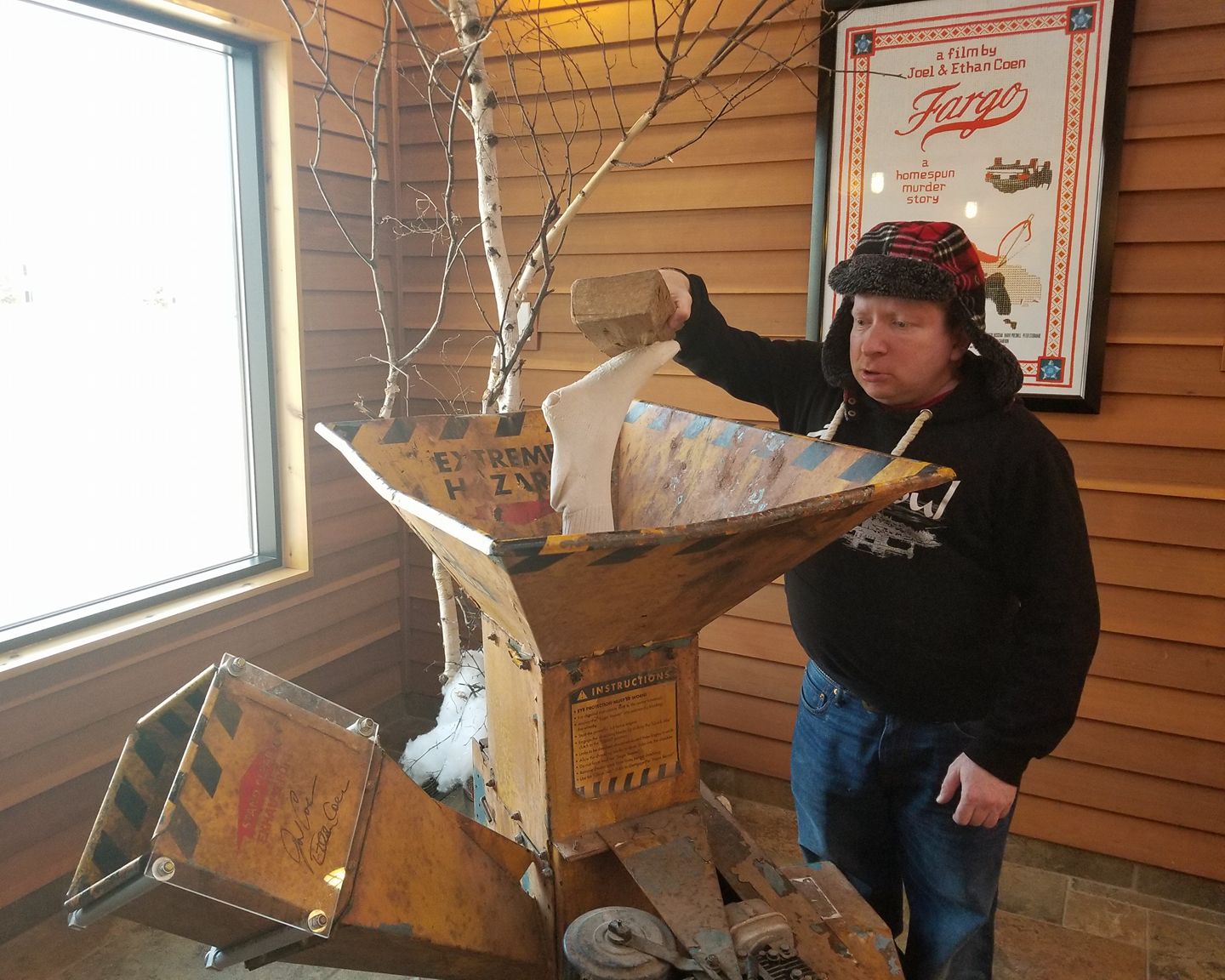 Me with the wood chipper from the film Fargo , on display at the Fargo-Moorhead Convention & Visitors Bureau.