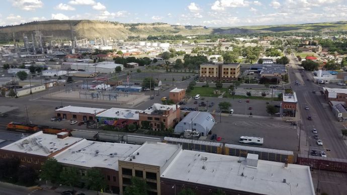 A view over the historic portion of downtown Billings towards the rock formation known as the Rimrocks.