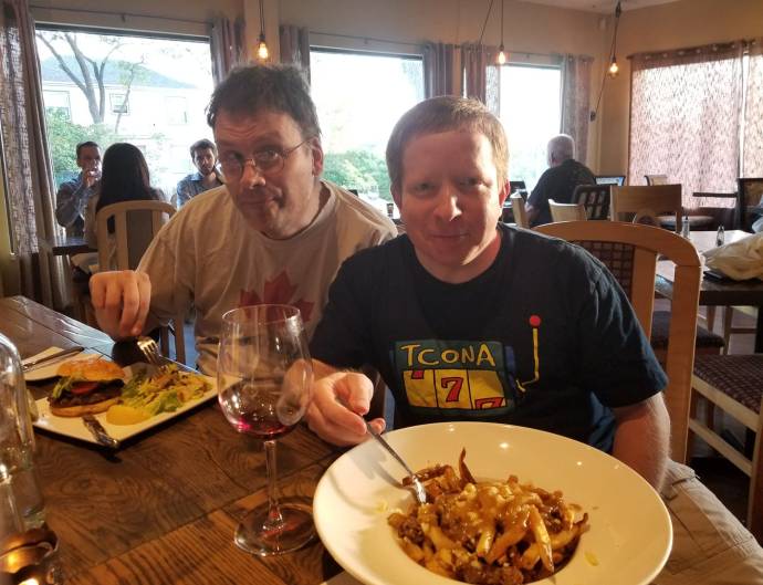 Enhancing my exploration of “the Peg” is that I have a friend, David, who lives there. Similar to the situation with Marty in Casper, I had known David online for a long time (although “only” about 10 years in David’s case), but had never met him in person. He, his wife Cheryl, and their children did a comprehensive job showing me around. Of course we went to the excellent Canadian Museum for Human Rights, a must for any Winnipeg visitor; but David and his family also took me to places that even a seasoned traveller like me might have remained unaware of if left to my own devices. They even took me to get some poutine, the unhealthful yet delicious Canadian dish. (The ingredients of basic poutine are fries, cheese curds, and gravy; I ordered mine with beef.)