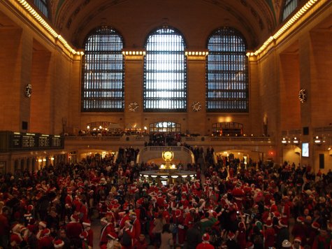 Anyhoo, after a long interlude at the Seaport and some of its many bars and restaurants, the Santas moved on to occupy City Hall Park. Or at least they occupied it until the NYPD arrived on the scene and announced that the park was being closed. Then the scene shifted to Grand Central Terminal. The concourse at Grand Central is famously crowded; indeed, the very name of the station has become synonymous with huddled masses of humanity. But even during rush hour, you will rarely see the cavernous room packed as tightly it was yesterday afternoon. And amid the profusion of Santaconners, a brass band was present to to provide live entertainment to whoever was lucky enough to be on hand: