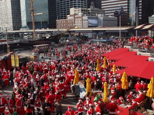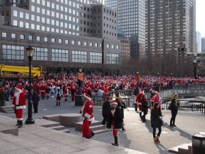 Santas processing through lower Manhattan, near Bowling Green Park.