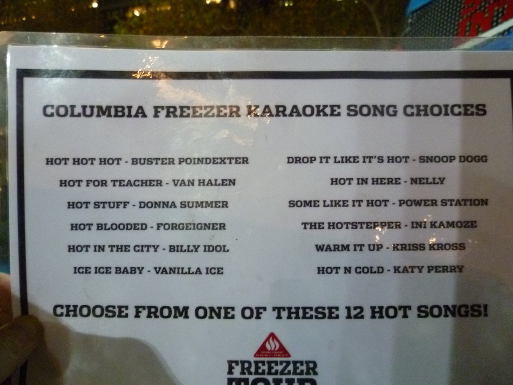 I monitored the digital temperature readout next to the freezer door, and wondered how I would cope with the Arctic conditions without gloves or ear-grips to protect my extremities (Those accessories were not provided by the organizers. Although, in fairness, I can’t really blame them. Would you want to wear gloves that dozens of people’s hands had been in?). Still, the singers who preceded me did not appear to be suffering from frostbite when they emerged from the freezer.