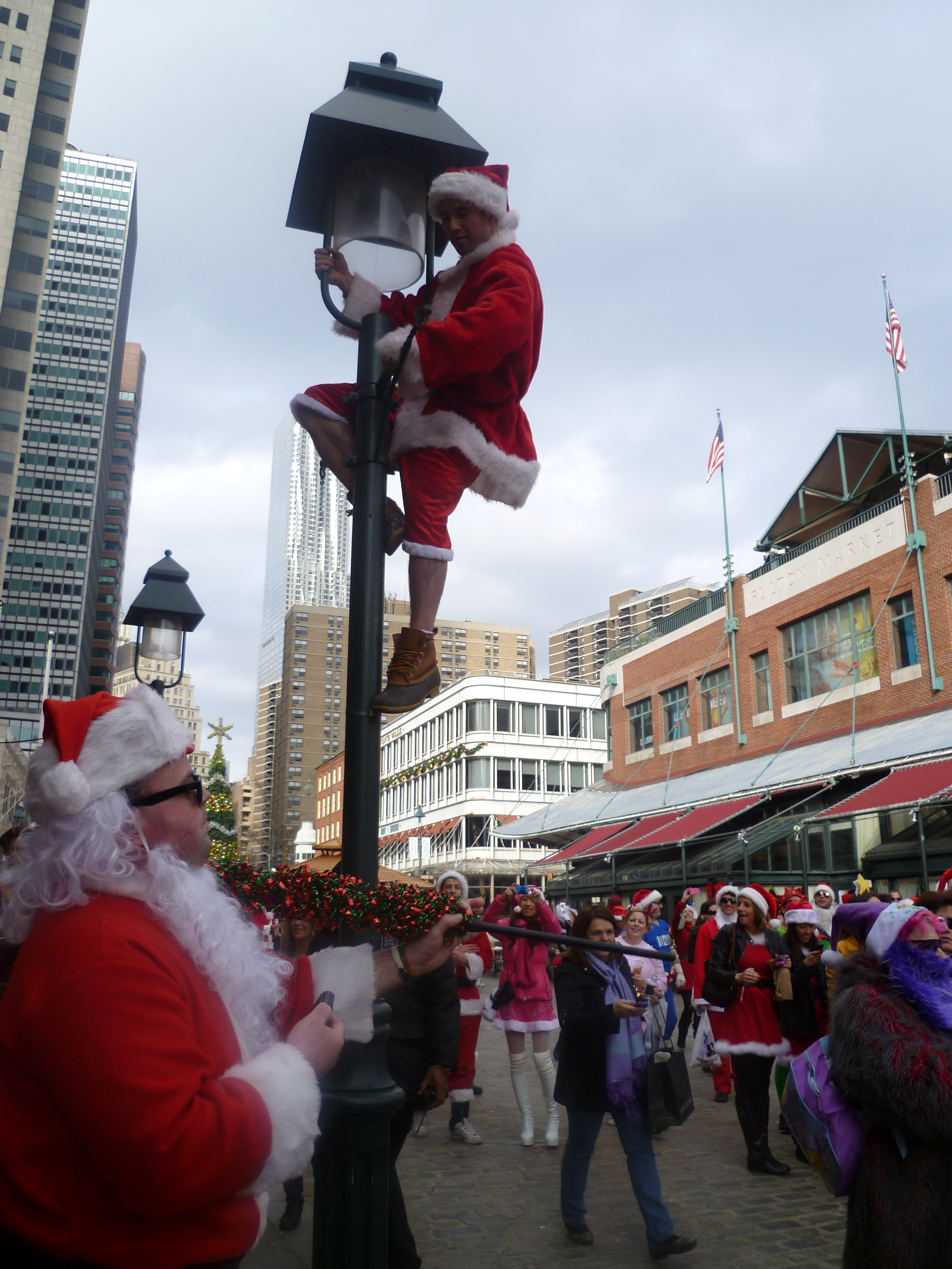 Incidentally, one of my all-time favorite Santacon moments occurred during the stroll over to the South Street Seaport. Hundreds, if not thousands, of Santas were walking down the street. A young kid, maybe eight years old, was standing in front of a building and watching the procession of Santas. The kid yelled out, “Are you the real one?”