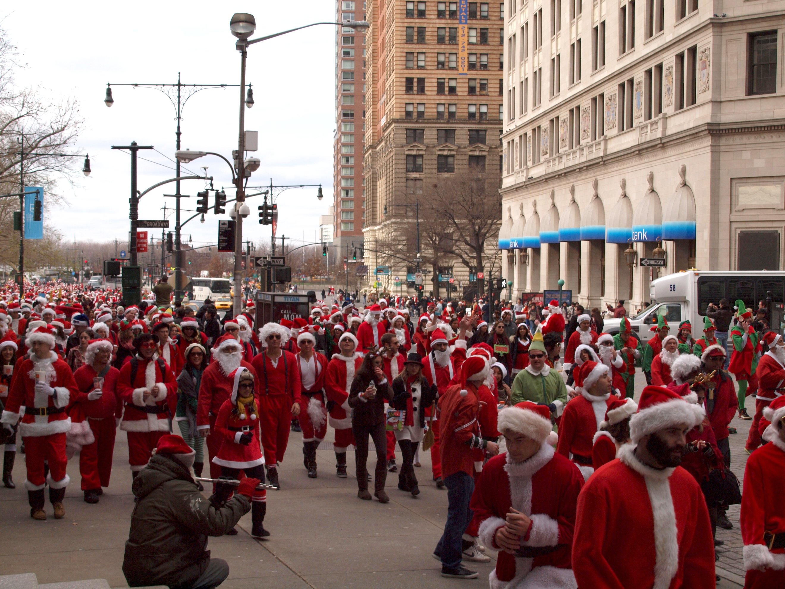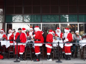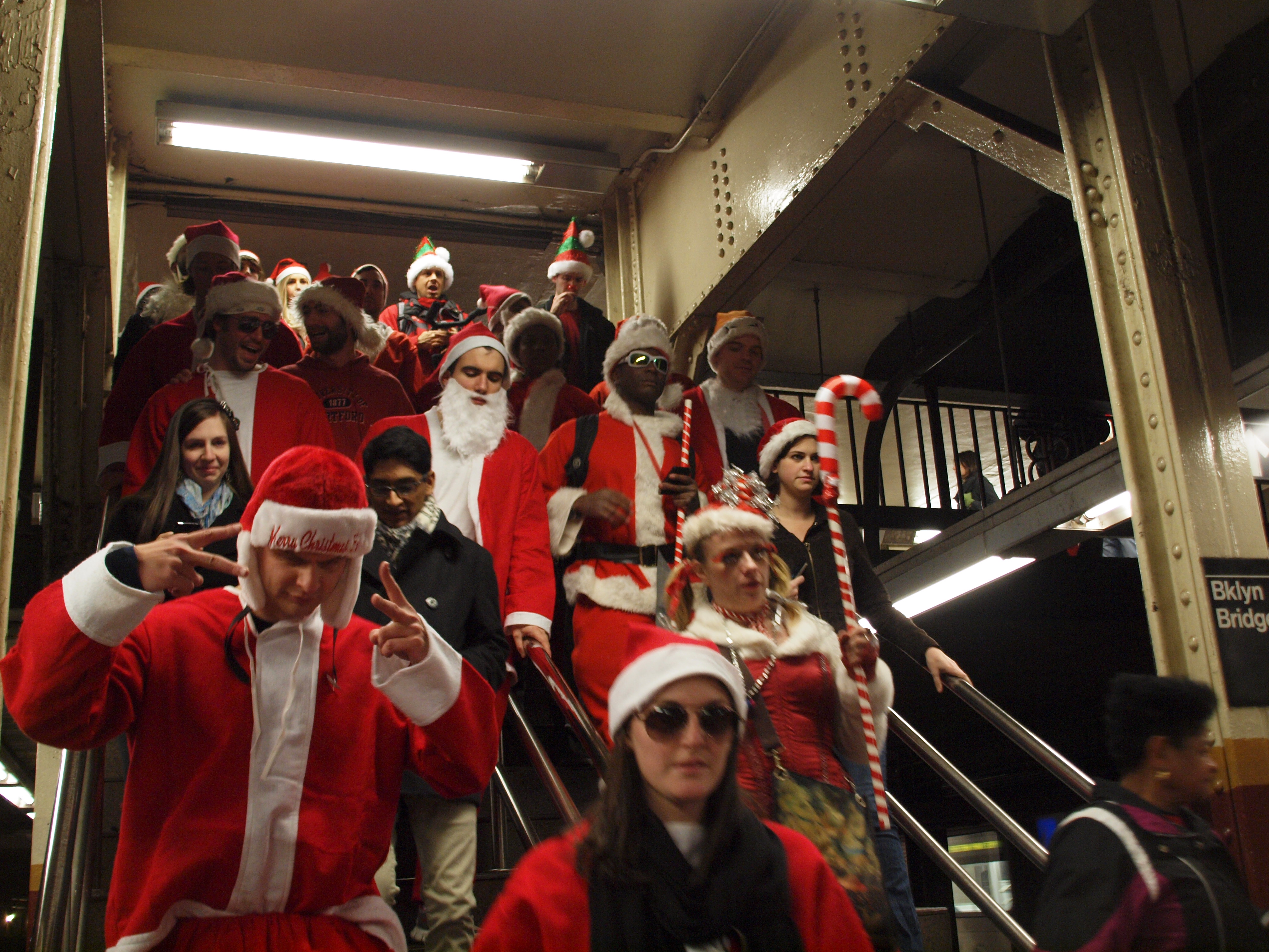 As with a more conventional pub crawl, the actual getting around involves a considerable amount of walking. Sometimes, however, the distance to be traversed is just too great, and the Santas must descend underground to ride the subway. Chants such as “Santa rides the 6!” (a reference to the number 6 subway line that serves the East side of Manhattan) are not uncommon in that situation. Hordes of Santas pour into the subway trains, much to the befuddlement of the non-Santacon-affiliated passengers on board; and the rides tend to be punctuated with (often dissonant) caroling.