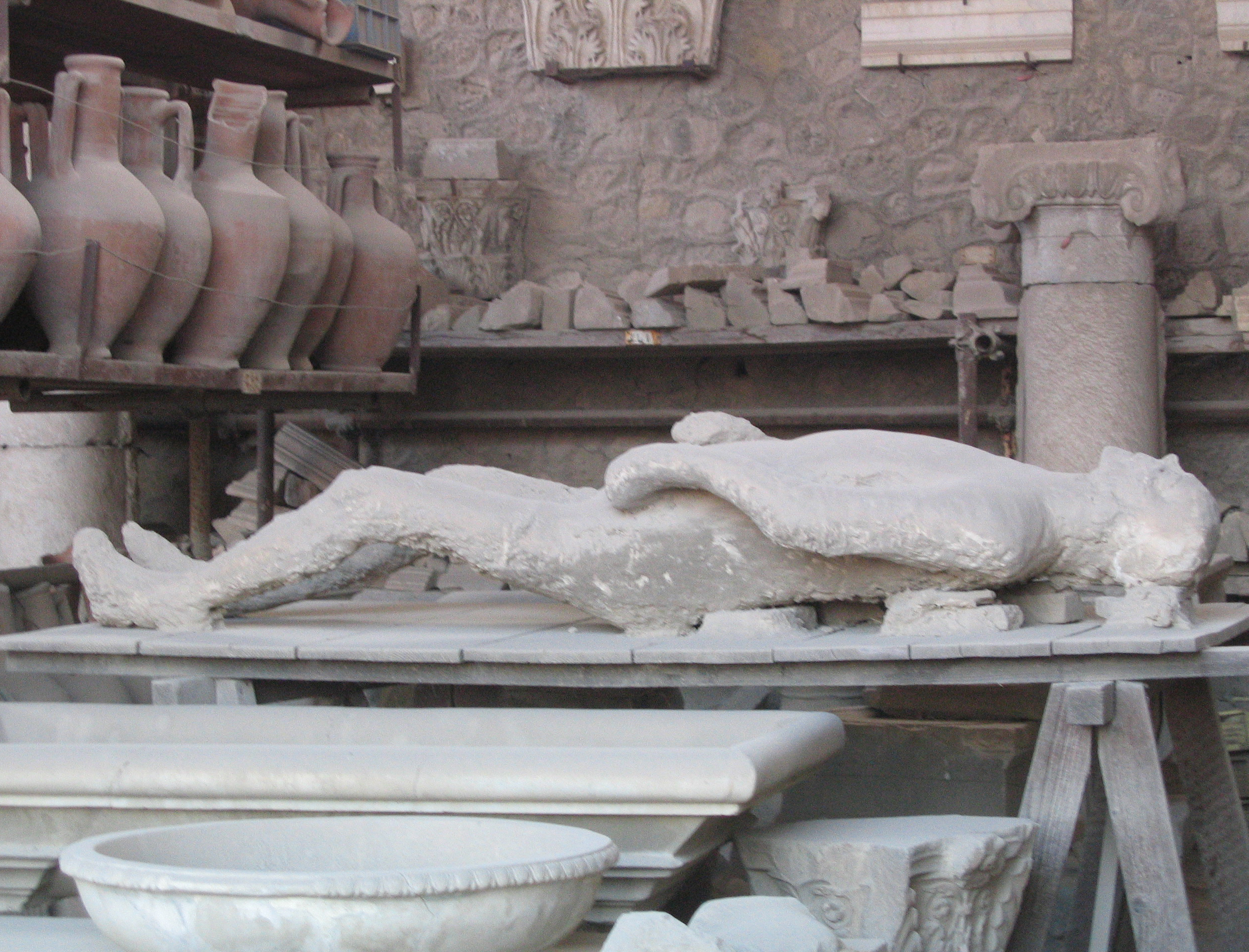 And you can even see (sort of) some of the people who lived and worked in those buildings; one of the most unusual series of items on display in Pompeii is the plaster casts of some of the Vesuvian victims (see photo at right). When Pompeii was excavated, found in the volcanic ash were indentations in the shape of some of the human casualties. Those impressions preserved for centuries the poses that the victims had been in when nature’s wrath overtook them. The archaeologists made plaster casts from the indentations. However, the presentation of many of the casts leaves something to be desired. For example, the one seen here is just lying on a wooden table in a storage room.