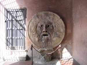 And the Roman landmarks that I toured did not disappoint: the Colosseum (also known as the Flavian amphitheater); the Forum; the Pantheon; St. Peter’s Basilica and the Vatican Museums (including the Sistine Chapel); Trevi Fountain; and the Spanish steps. One of the less clichéd attractions that I was privileged to behold was the Bocca della Verita (Mouth of Truth), which was the subject of a famous scene in the Gregory Peck and Audrey Hepburn film, Roman Holiday. This image of a river god has hung in its present location in the Church of Santa Maria in Cosmedin since 1632 (see photo at right). A legend holds that if you insert your arm in its maw and tell a lie, the Mouth of Truth will swallow your arm. I did not put that legend to the test. 🙂